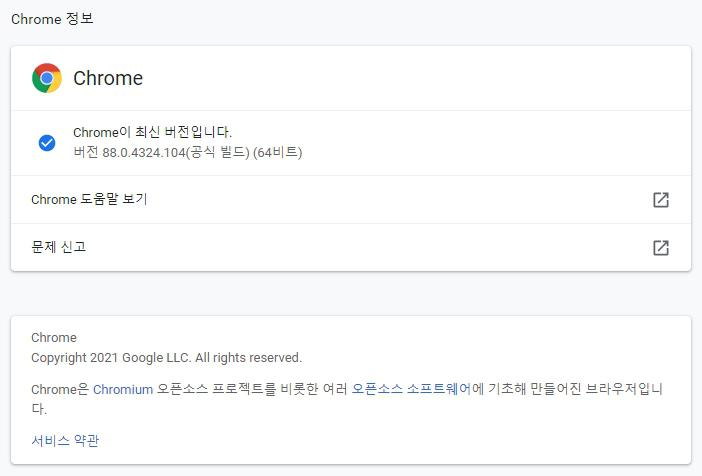 2021년 1월 19일에 공개된, 크롬과 크로미움(Chromium)의 최신 버전은 88.0.4324.104 입니다.